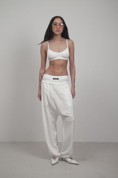 Harem pants with a low crotch and tapered leg